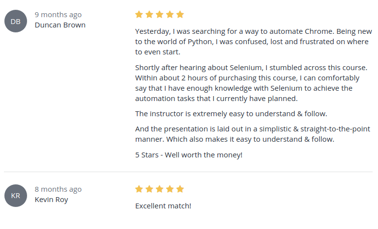 Shortly after hearing about Selenium, I stumbled across this course. Within about 2 hours of purchasing this course, I can comfortably say that I have enough knowledge with Selenium to achieve the automation tasks that I currently have planned.