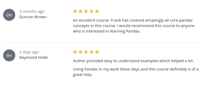 "Really nice course, leave you with enough knowledge that you feel confident on working with pandas."